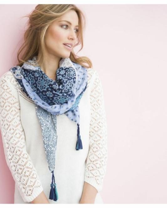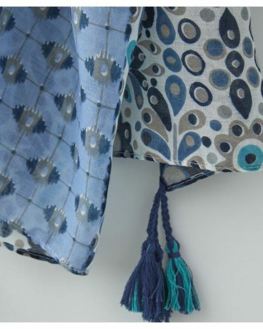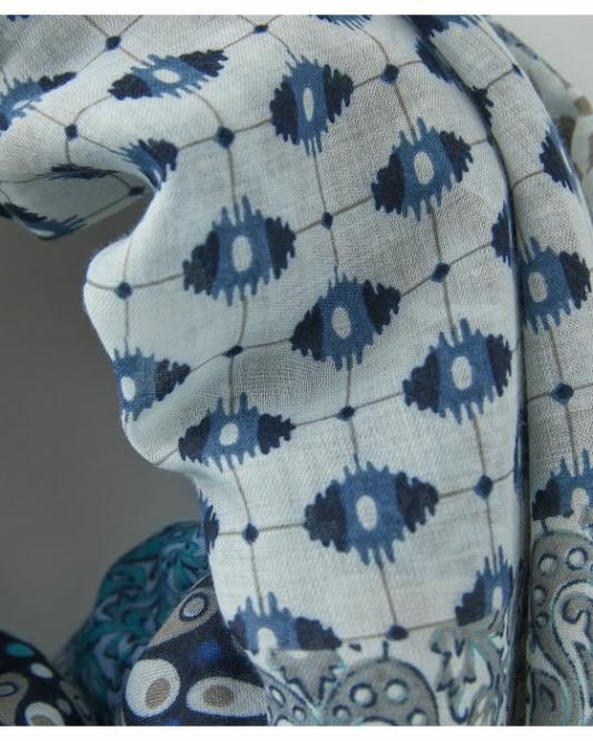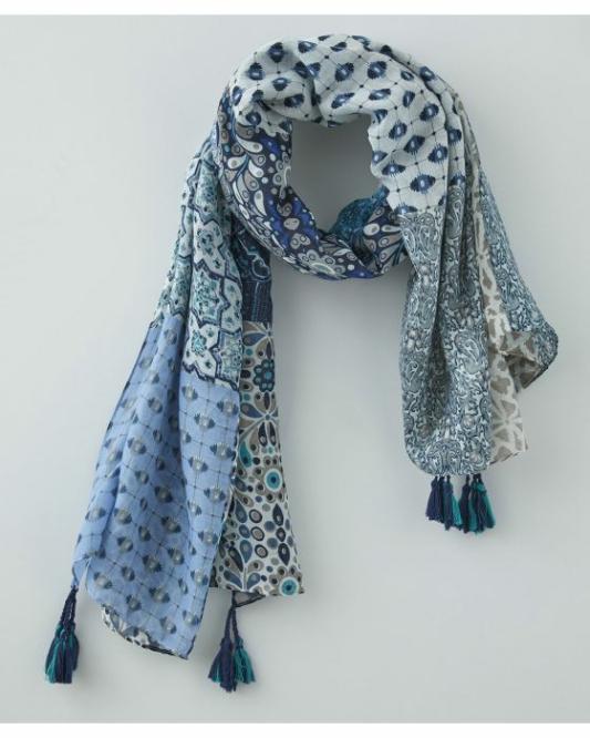 Femme Damart Foulards, | Etole Imprimé Patchwork À Pompons Bleu Assortis